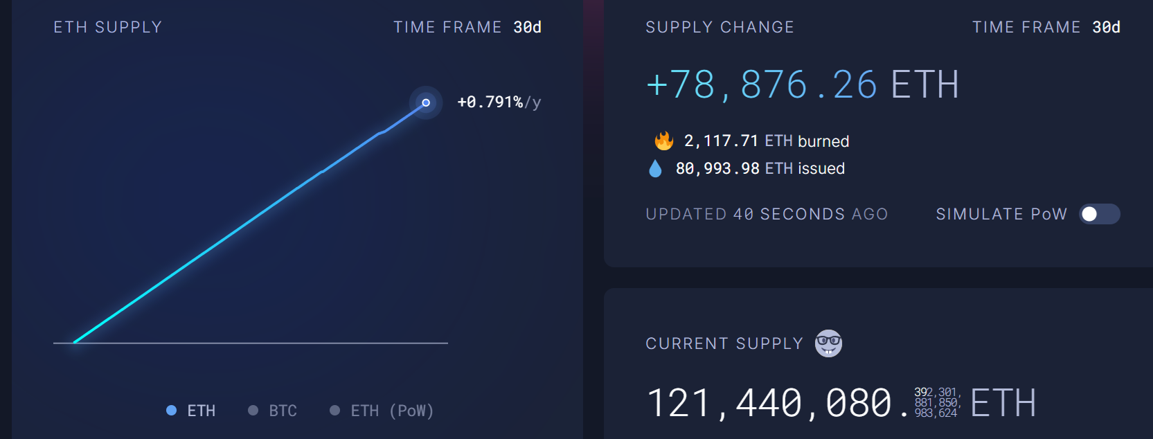 Часть разочарования инвесторов связана с тем, что стратегия сделать ETH дефляционным не сработала на фоне падения активности в сети Ethereum. Встроенный механизм сжигания зависит от спроса на обработку данных на базовом уровне; при слабом спросе предложение ETH начинает расти. За последние 30 дней годовые темпы роста выпущенного ETH достигли 0,8% — заметный скачок по сравнению с периодом год назад, когда сопоставимая инфляция была близка к 0%.