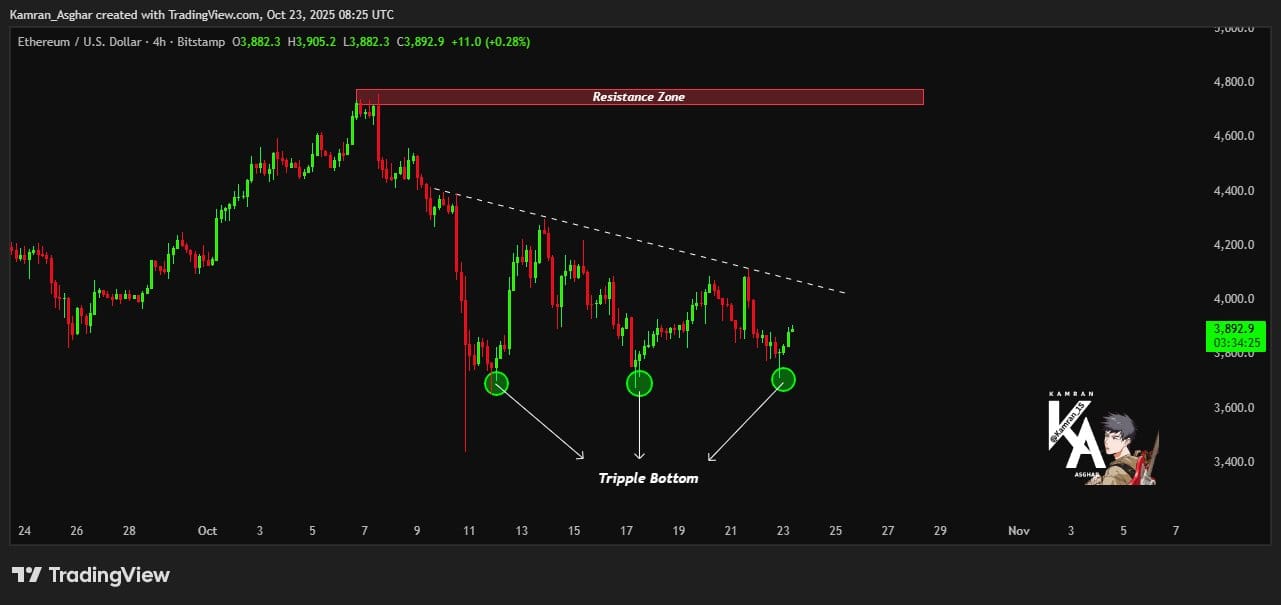 По состоянию на четверг, 4-часовой график Ether показывает тройное дно — формацию, возникающую, когда цены трижды достигают одной и той же отметки поддержки и не могут прорваться ниже.