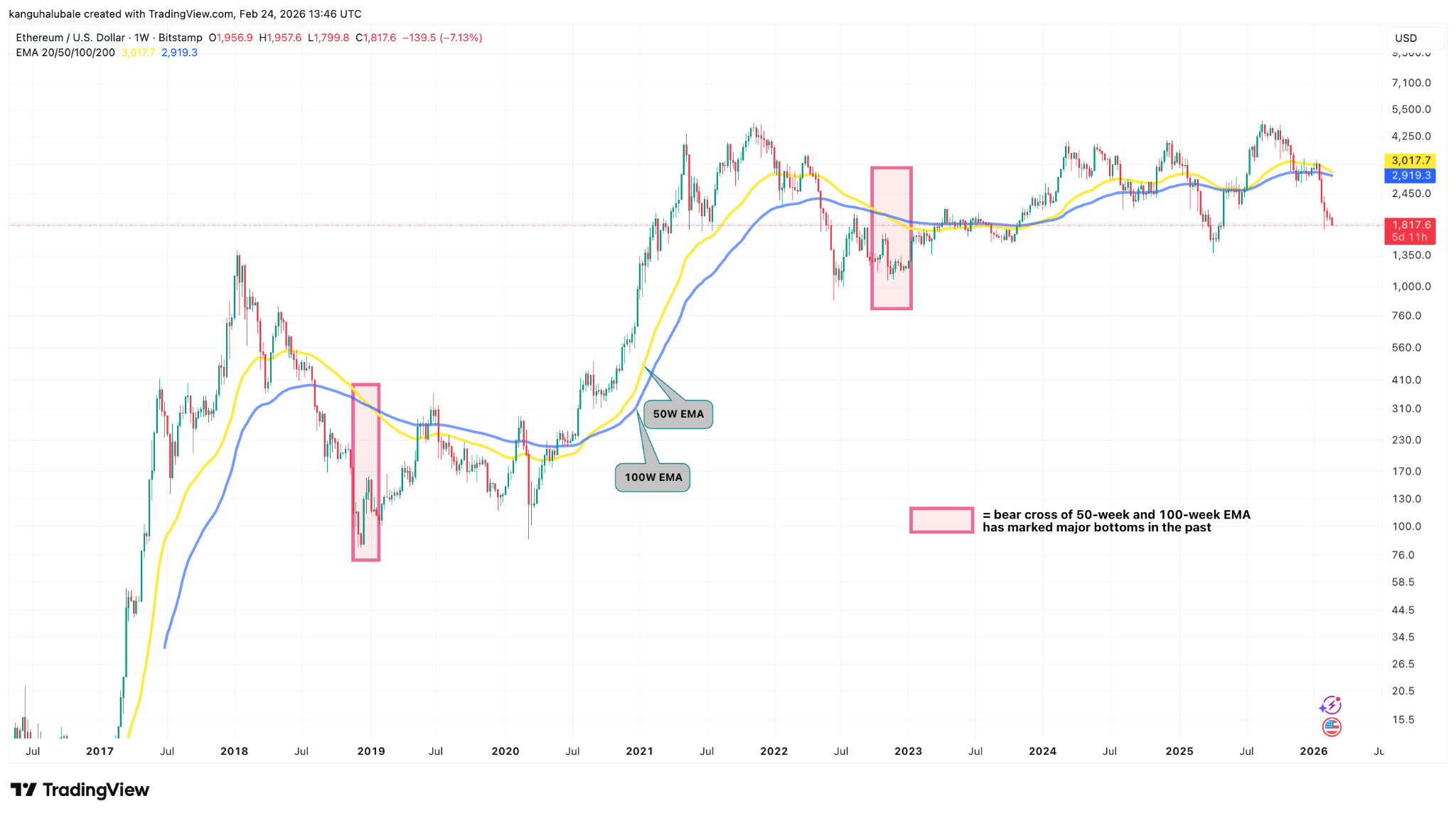 Исторически Ethereum находил устойчивое «дно» лишь после того, как 50-недельная экспоненциальная скользящая средняя (EMA) опускалась ниже 100-недельной EMA. Такое пересечение отмечало завершение крупных медвежьих рынков, включая 2022 и 2018 годы.