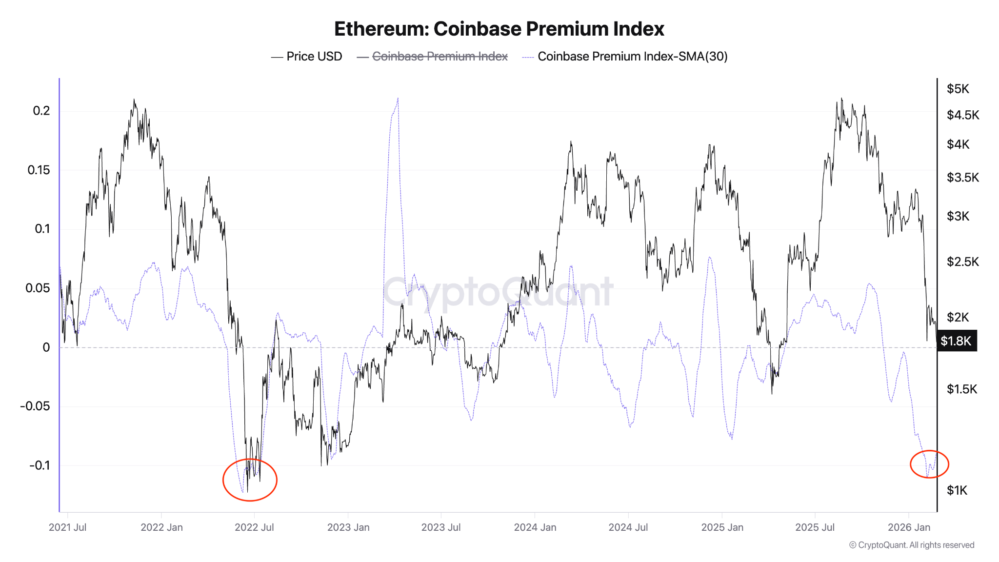 Индекс премии Coinbase для Ethereum, отражающий разницу цен ETH на Coinbase и Binance, 6 февраля опускался до -0,11 и затем частично восстановился до -0,09.