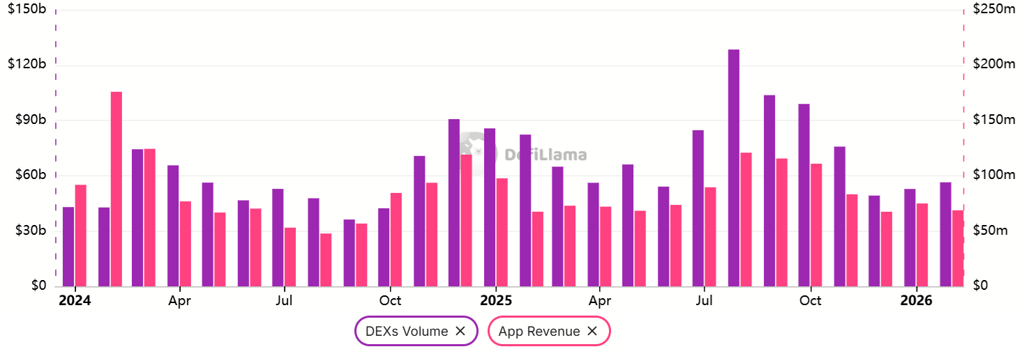 В феврале 2026 года DEX-объемы в Ethereum сократились до $56,5 млрд — заметно ниже пика $128,5 млрд в августе 2025 года. За тот же период месячные объемы Solana достигли $95,5 млрд, снизившись со $120,6 млрд в августе. Падение активности давит на комиссии сети и доходы децентрализованных приложений (DApp), ослабляя краткосрочные стимулы держать ETH.