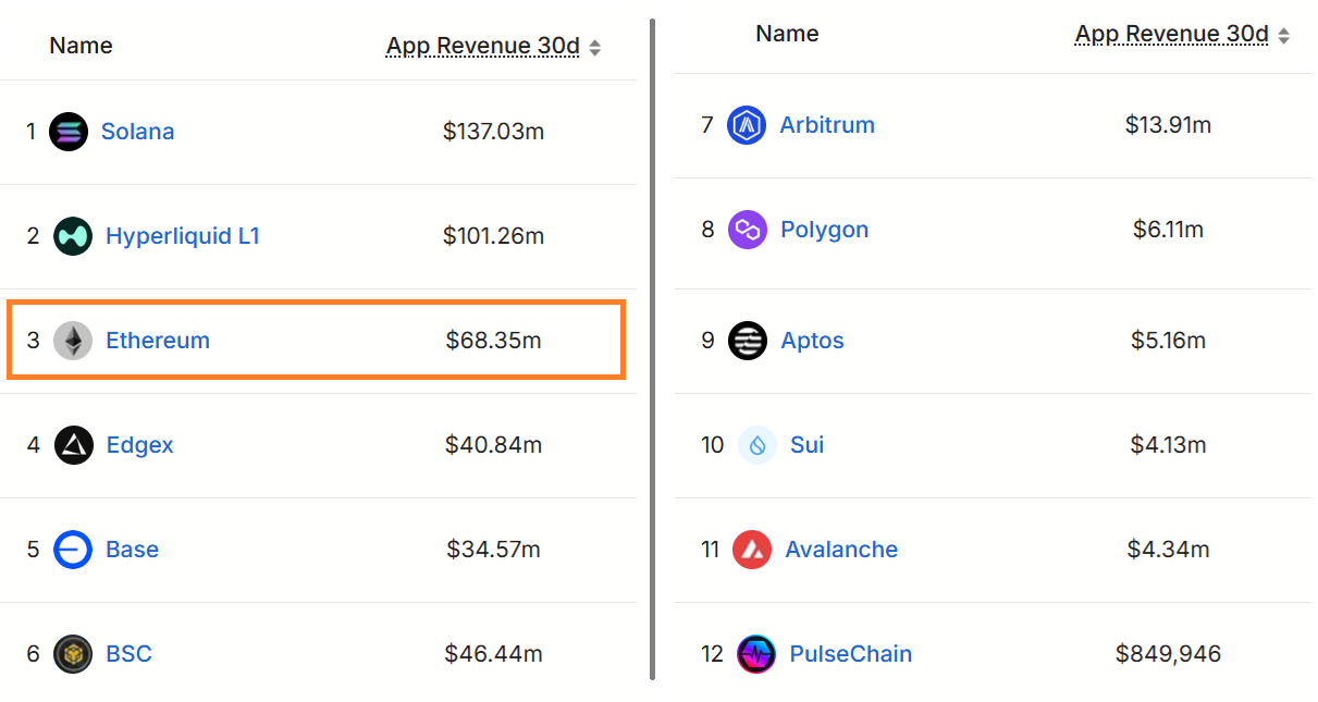 Доминирование Ethereum в общем объеме заблокированной стоимости (TVL) и успешное принятие решений второго уровня неоспоримо. Тем не менее, трейдеры задаются вопросом, трансформируются ли эти сильные стороны в более высокие доходы для децентрализованных приложений, построенных на Ethereum. Solana в настоящее время имеет конкурентное преимущество в доходах DApps, в то время как такие новые игроки, как Hyperliquid, также представляют растущие вызовы.