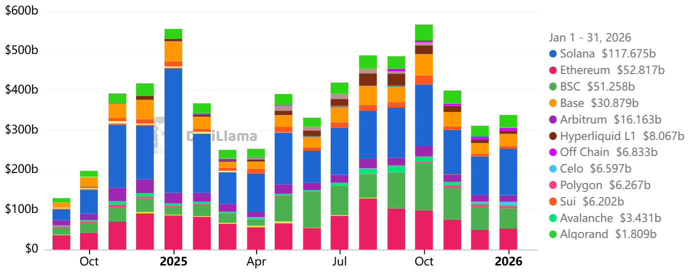 Объем торгов на децентрализованных биржах (DEX) в сети Ethereum в январе составил $52,8 млрд, тогда как в октябре 2025 года он достигал $98,9 млрд. Снижение активности на 47% уменьшает стимулы для держателей: обычно высокий спрос на обработку транзакций запускает механизм сжигания, сокращающий общее предложение ETH.