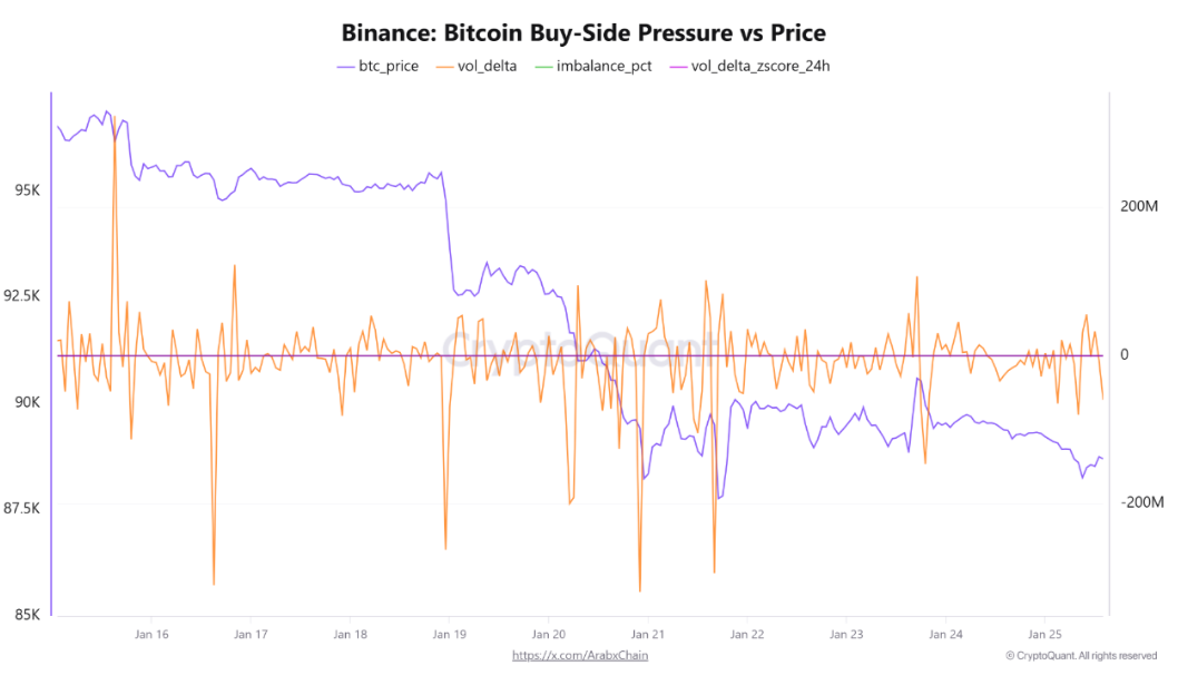 Разбирая падение к $86 000, CryptoQuant не увидел признаков паники. Аналитик Arab Chain изучил дельту объема в стаканах и отметил, что на Binance она достигала около $59,6 млн во время снижения — это говорит о перевесе продавцов, но без резкого обвала цены.