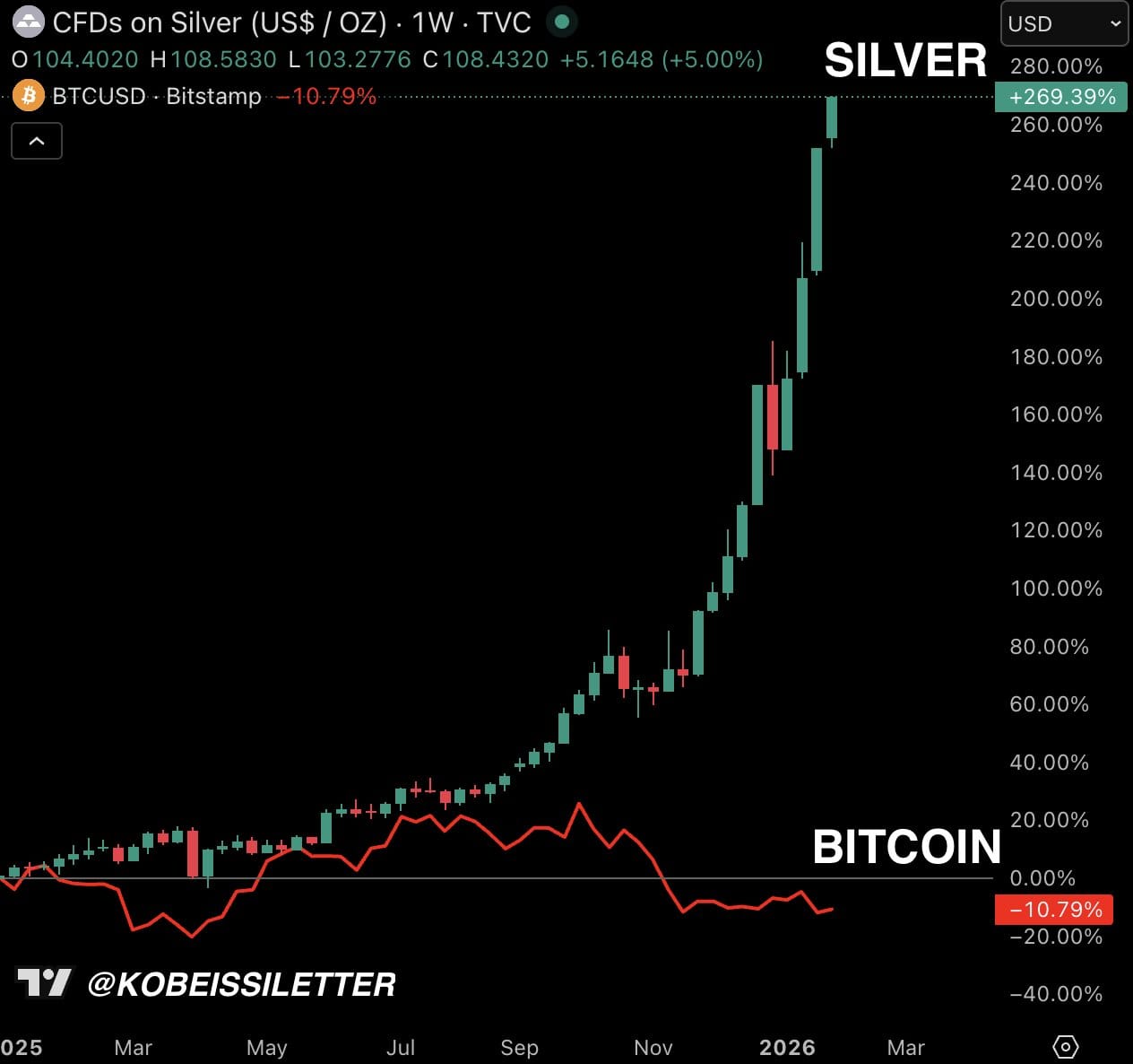 На фоне ралли драгметаллов биткоин и альткоины остаются в узком диапазоне уже несколько месяцев, и эта обратная динамика начинает заметно обсуждаться за пределами криптосообщества. The Kobeissi Letter обратил внимание, что серебро за примерно 13 месяцев выросло на 270%, тогда как биткоин снизился на 11%, из-за чего капитализация серебра стала примерно в 3,5 раза больше.