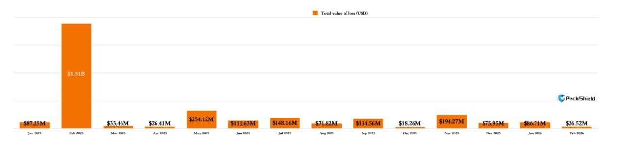 По данным компании по блокчейн-безопасности PeckShield, в феврале месячные потери от криптовзломов и мошенничества оказались самыми низкими с марта 2025 года: за месяц было похищено $26,5 млн.