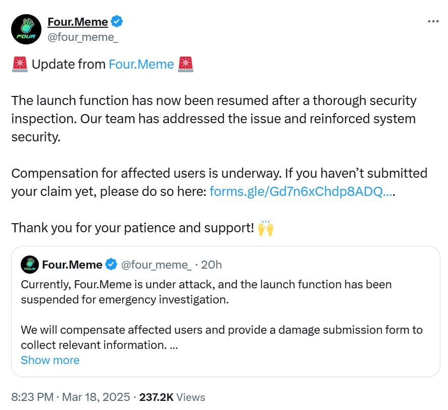 18 марта Four.Meme сообщила в публикации на X, что функция запуска была восстановлена после проверки и устранения проблемы безопасности. Ранее платформа приостановила работу функции, заявив, что она подверглась атаке.
