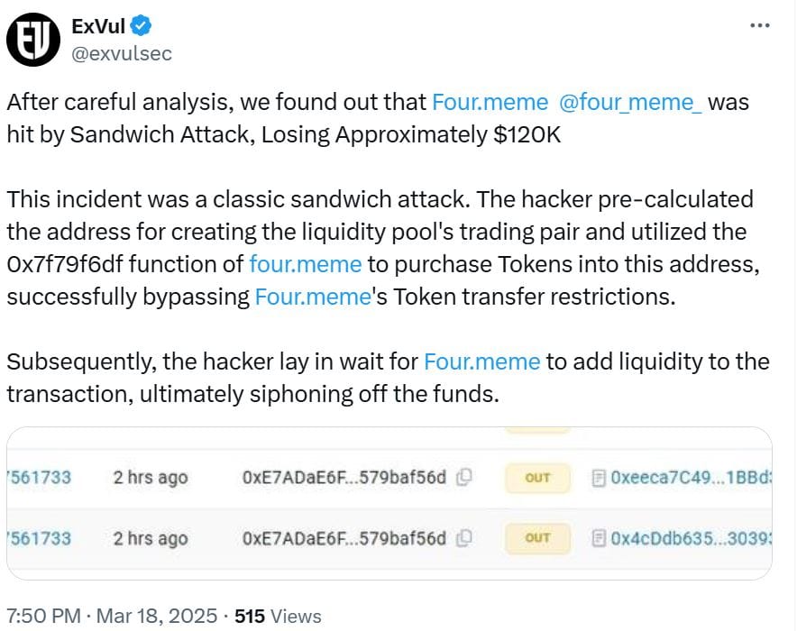 «Затем хакер ожидал, пока Four.Meme добавит ликвидность в транзакцию, в конечном итоге похитив средства», – добавили в ExVul.