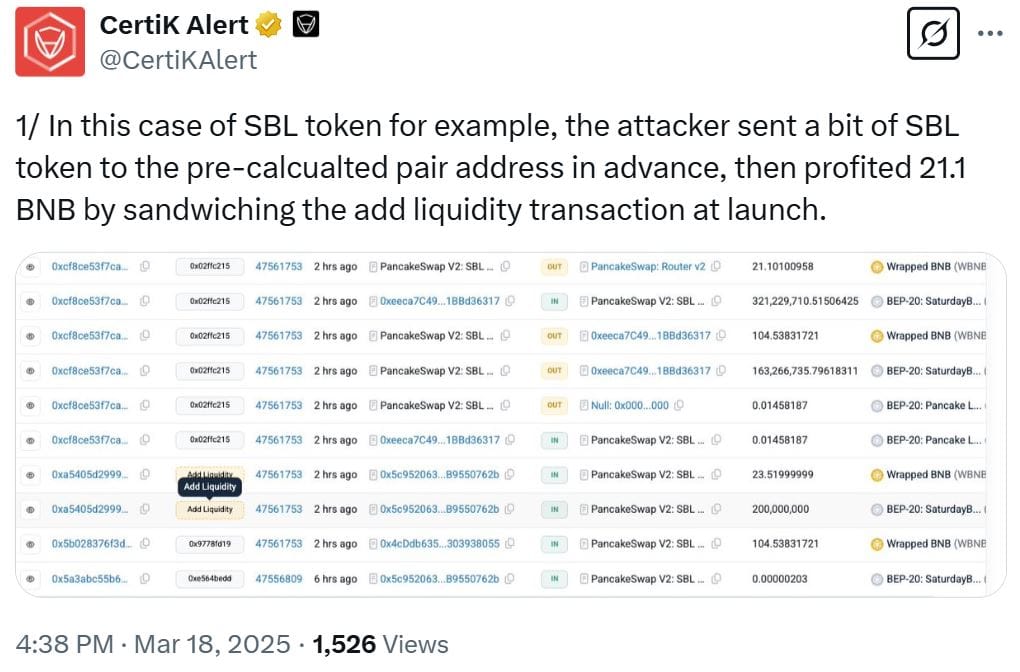 «В случае с токеном SBL, например, атакующий заранее отправил немного токенов SBL на заранее рассчитанный адрес пары, а затем заработал 21.1 BNB, обернув транзакцию по добавлению ликвидности при запуске», – отметили в CertiK.