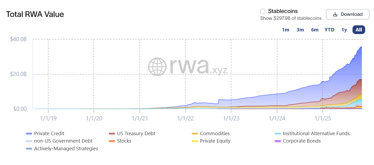 Общая стоимость токенизированных реальных активов, исключая стейблкоины, выросла примерно до $36,6 миллиардов, согласно отраслевым данным. Институциональные фонды составляют около $3 миллиардов от этой суммы, в то время как токенизированные казначейские обязательства США составляют примерно $8,4 миллиарда.