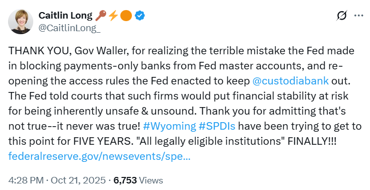 "Спасибо, губернатор Уоллер, за осознание ужасной ошибки, которую сделала ФРС, блокируя банки, занимающиеся исключительно платежами, от мастер-счетов ФРС, и за повторное открытие правил доступа, установленных ФРС, чтобы исключить @custodiabank," написала Кэтлин Лонг, основательница и генеральный директор Custodia Bank, в своем посте во вторник, добавив: