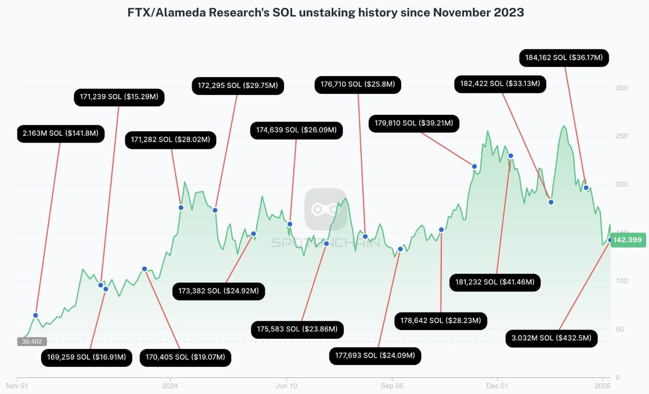 Данные, предоставленные платформой анализа блокчейнов Spot On Chain, показывают, что с ноября 2023 года FTX вывела 7,83 миллиона SOL. Spot On Chain сообщает, что FTX и Alameda продали токены, стоимость которых составила около $986 миллионов, на площадках Coinbase и Binance по средней цене $125,80 за SOL.