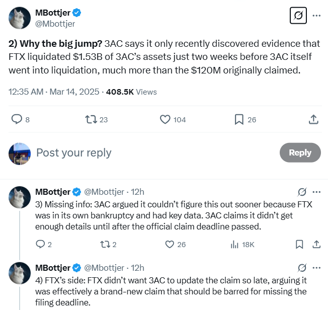 3AC “попросила суд по делам о банкротстве разрешить ей увеличить иск против FTX с 120 миллионов долларов до 1,53 миллиарда долларов,” сообщает “Mbottjer,” псевдоним одного из основателей FTX Creditor, группы кредиторов FTX и покупателей требований.