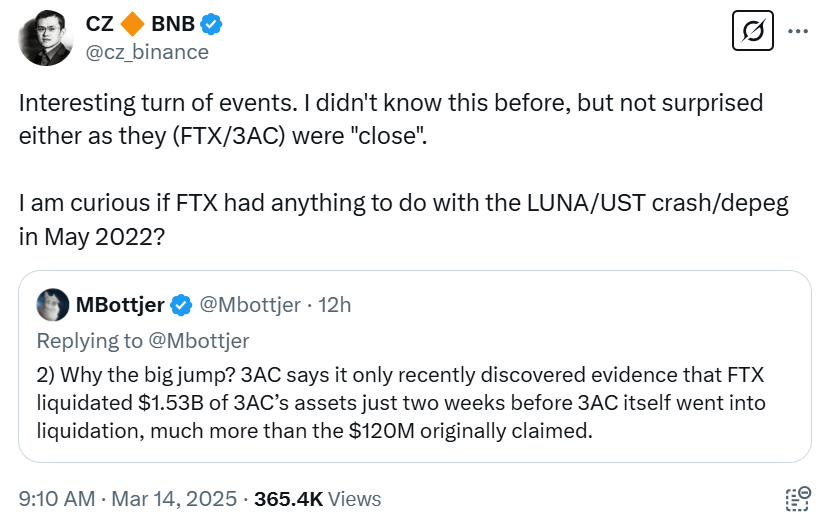 “Мне интересно, проявила ли FTX какое-либо участие в крахе LUNA/UST и их потере якоря в мае 2022 года,” сказал Чжао в посте X от 14 марта.