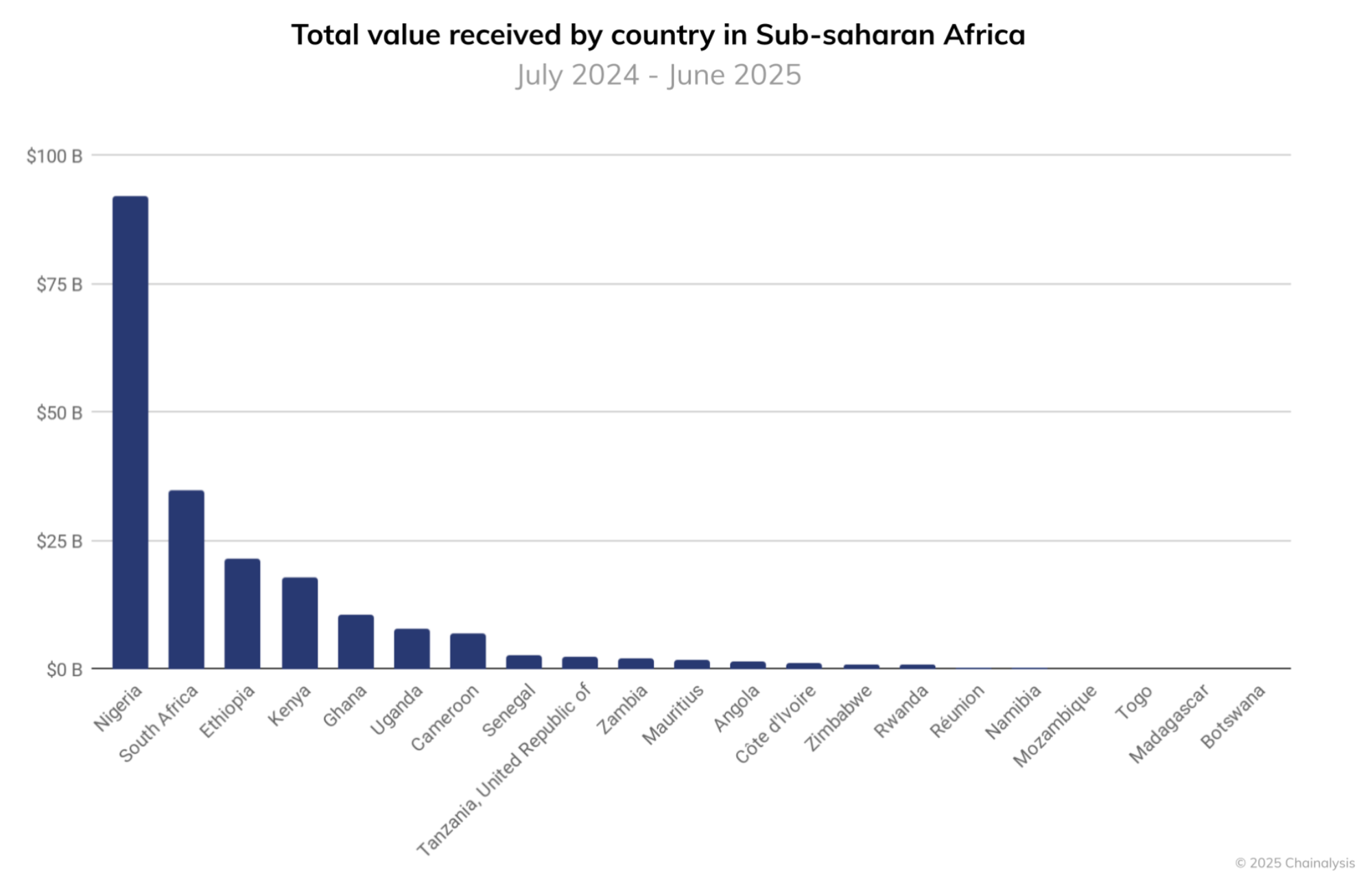 Регион Африки южнее Сахары получил более $205 миллиардов в ончейн-стоимости, что на 52% больше, чем в предыдущем году. Этот рост делает его третьим по скорости роста регионом в мире, уступая только Азиатско-Тихоокеанскому региону и Латинской Америке, согласно Chainalysis.