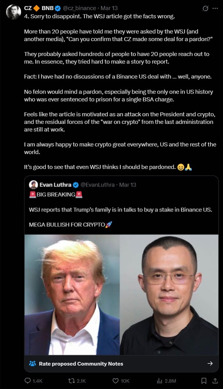 CZ опроверг отчёт в публикации на платформе X в тот же день. Трамп также опроверг отчёт в посте на своей социальной платформе Truth Social.