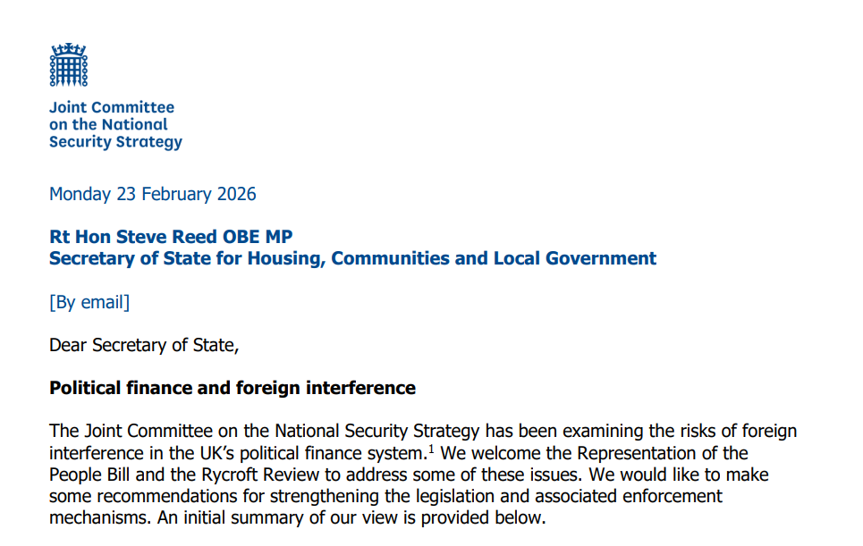 По словам Уэстерна, существует риск, что к следующим выборам активность иностранных государств, стремящихся влиять на финансирование британской политики, может усилиться.