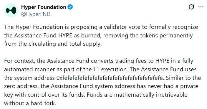 Hyper Foundation предложила провести голосование среди валидаторов, чтобы официально признать токены HYPE, находящиеся на системном адресе Фонда помощи Hyperliquid, как навсегда недоступные, исключив их из обращения и общей эмиссии.