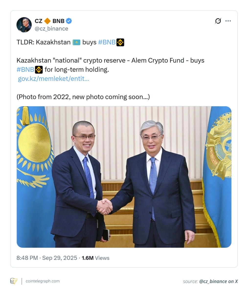 Бывший генеральный директор Binance Чанпэн "CZ" Чжао публично отметил покупку фондом BNB, подчеркнув её значимость. Эта первая покупка показывает, что Казахстан исследует более широкий, ориентированный на утилиту подход к цифровым активам, а не отдает предпочтение биткоину.