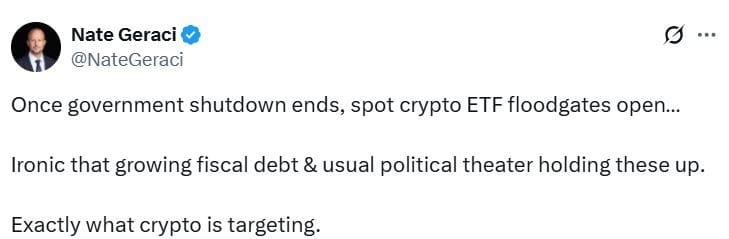 Aналитик ETF и президент NovaDius Wealth Management Нейт Гераси предсказал в посте на X в понедельник, что "Как только заканчивается приостановка работы правительства, открываются шлюзы для крипто ETF", ожидая массовых одобрений.