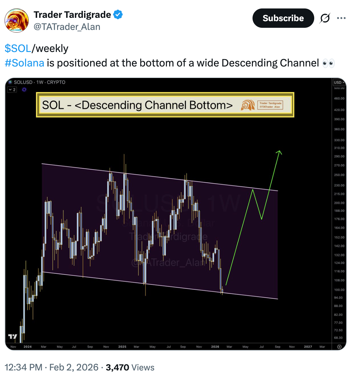 Трейдер Trader Tardigrade отметил, что отскок SOL от нижней границы нисходящего канала способен подтолкнуть цену к верхней границе примерно в районе $215.