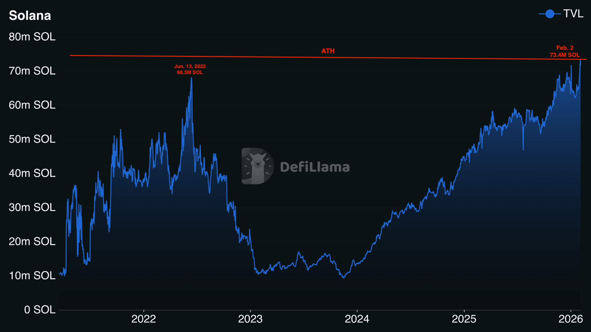 В прошлый раз дневные пики по этому показателю наблюдались в июне 2022 года, когда TVL превышал 68,3 млн SOL. Тогда рост во многом поддерживался высокой активностью сети и последствиями NFT-бума в Solana, что сопровождалось подорожанием SOL примерно на 80% в период с июня по август 2022 года.