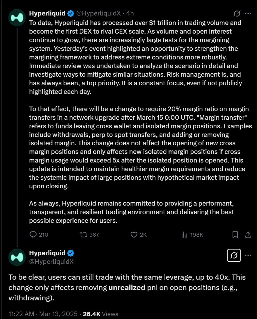 С 15 марта Hyperliquid начнет требовать от трейдеров поддержания маржинального обеспечения в размере не менее 20% для определенных открытых позиций, чтобы «снизить системное влияние крупных позиций с гипотетическим рыночным воздействием при закрытии», сообщила Hyperliquid в посте в X от 13 марта.