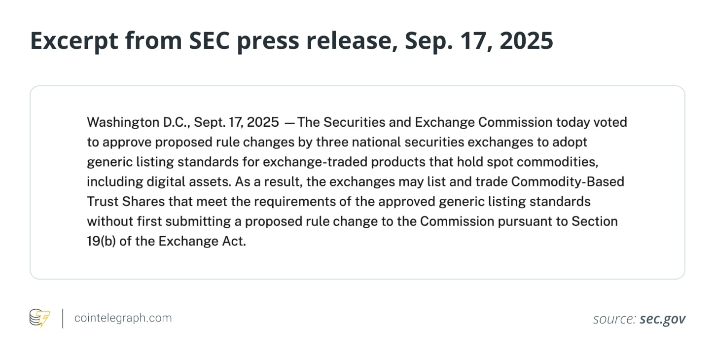 В середине сентября 2025 года SEC приняла общие стандарты листинга, позволяющие крупным биржам листвовать определенные спотовые криптообменные продукты (ETP) по единым правилам вместо однократных разрешений. Изменение упростило процесс листинга, но не убрало регуляторный надзор или проверку для непродуктов.