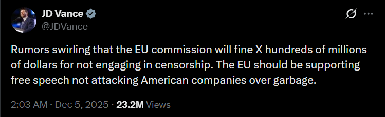 Действия против Х неизбежно вызовут напряжение в отношениях с США. Вице-президент Джей Ди Вэнс заявил, что регуляторы ЕС не должны "атаковать" американские компании.