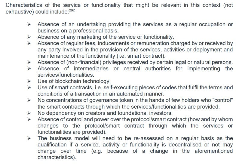 Еще одна тема отчета третьего набора — квалификация услуг, предоставляемых «полностью децентрализованно, без посредника», в контексте MiCA.