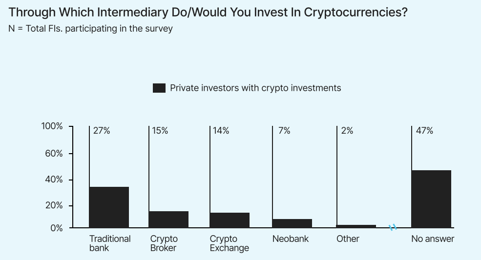 Увеличение числа криптовалютных продуктов от банков может повысить принятие криптовалют в Европе, учитывая, что 27% участников опроса предпочли бы инвестировать в криптовалюты через традиционный банк, тогда как только 14% выбрали бы криптобиржу.