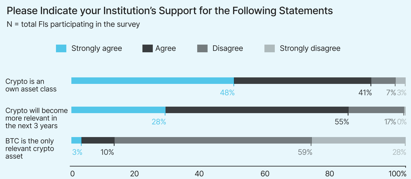 Кроме того, 28% опрошенных учреждений ожидают, что криптовалюты станут более актуальными в течение ближайших трех лет.