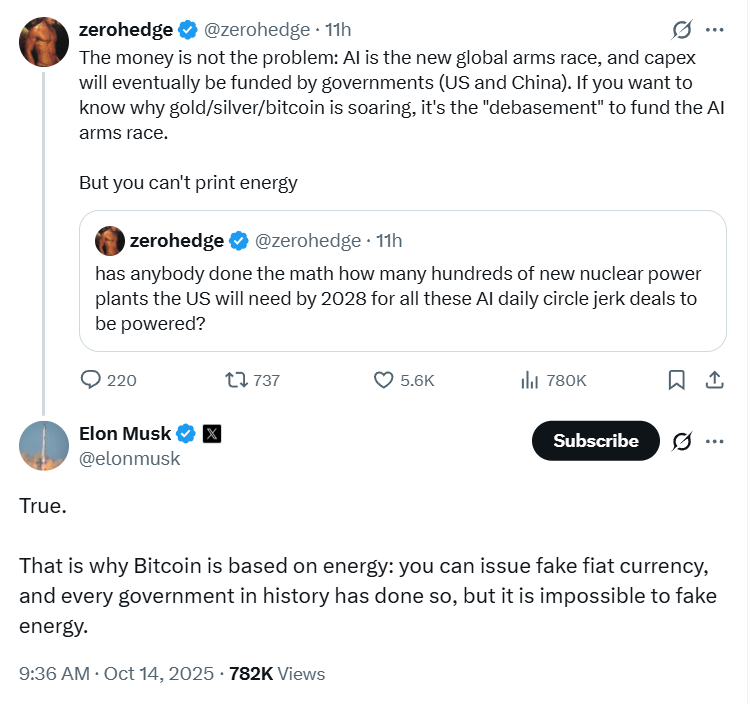 Комментарий Маска стал ответом на пост популярного аналитика Zerohedge, который приписал текущий импульс биткойна и драгоценных металлов "обесцениванию" для финансирования правительственно спонсируемой гонки вооружений в области ИИ, которая развернется между крупнейшими экономиками мира.