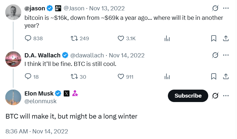 “BTC справится, но это может быть долгая зима,” написал Маск в посте на X 14 ноября 2022 года, отвечая на то, что биткойн достиг предыдущего минимума на медвежьем рынке в $16,000.