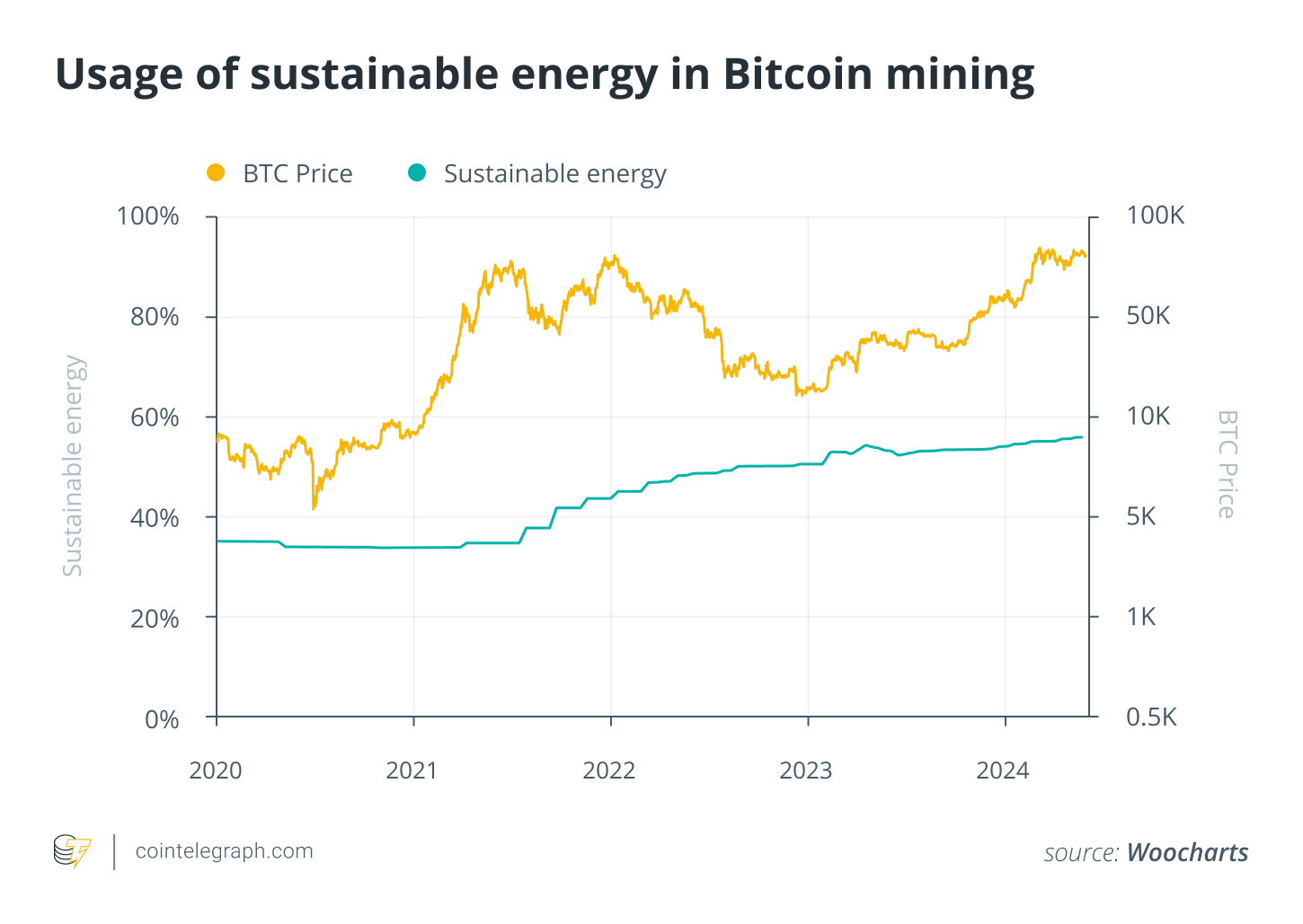 Использование устойчивой энергии в майнинге биткойнов достигло рекордного уровня более 55%, согласно графику, смоделированному венчурным капиталистом в области климатических технологий Даниэлем Бэттеном и аналитиком биткойнов Вилли Ву.