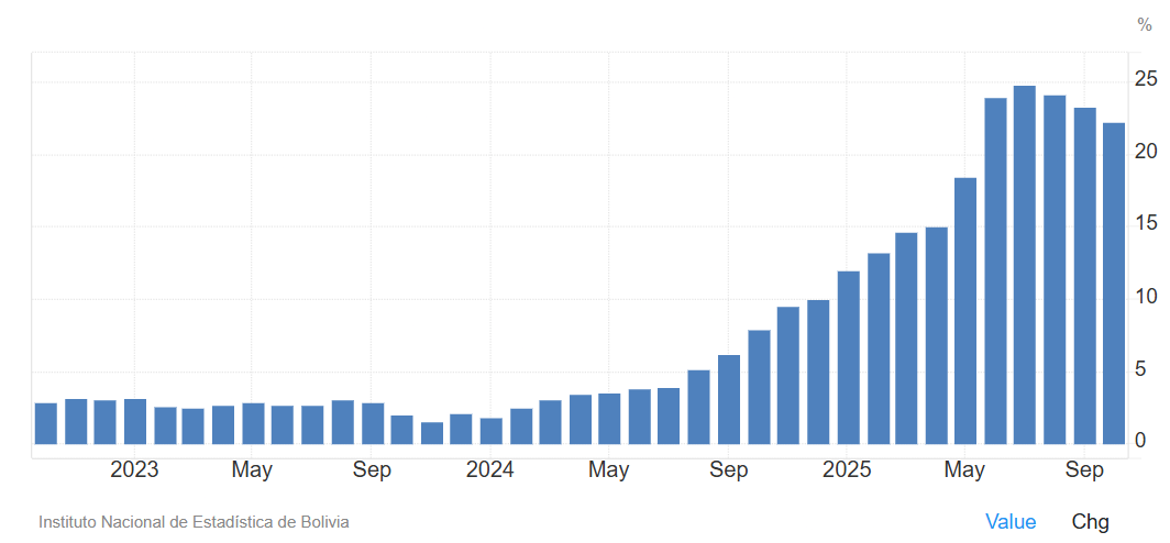 Боливийская валюта, боливиано, пережила резкий рост инфляции за последний год. Хотя с лета инфляция снизилась, в октябре 2025 года она остается выше 20%.