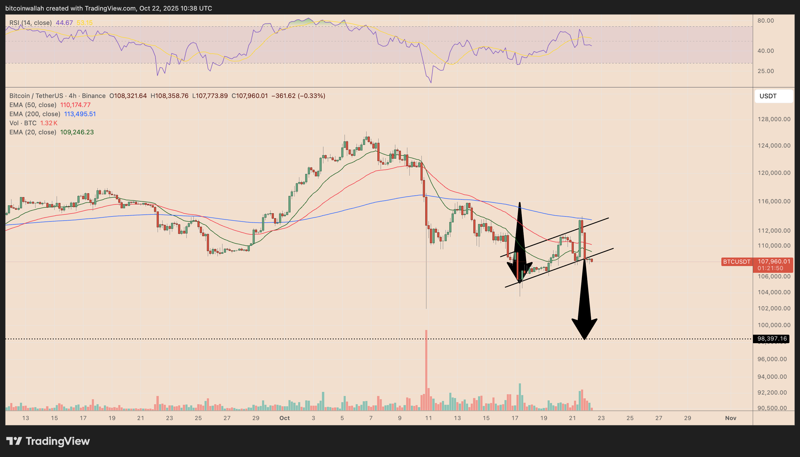 BTC также торгуется ниже своих 20- (зеленая) и 50-4H (красная) экспоненциальных скользящих средних (EMAs), что совпадает с областью сопротивления $109,000-110,000. Если не удастся вернуть эту область в качестве поддержки, это может подтвердить медвежий настрой.