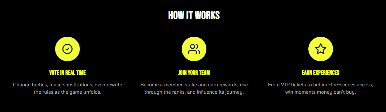 В модели Arena Two зрители используют токен ATWO, чтобы голосовать за конкретные игровые решения прямо во время матча — например, выбрать более оборонительную тактику или рискованный атакующий вариант. Голосование проходит через мобильное приложение.