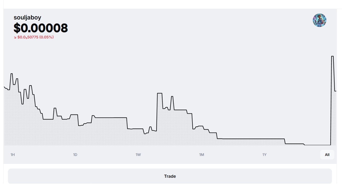 Новый токен Soulja Boy (SOULJABOY) не получил большого отклика. С момента запуска в пятницу токен достиг рыночной капитализации в $85,000 и получил инвестиции от 331 держателя, согласно данным из приложения Base.