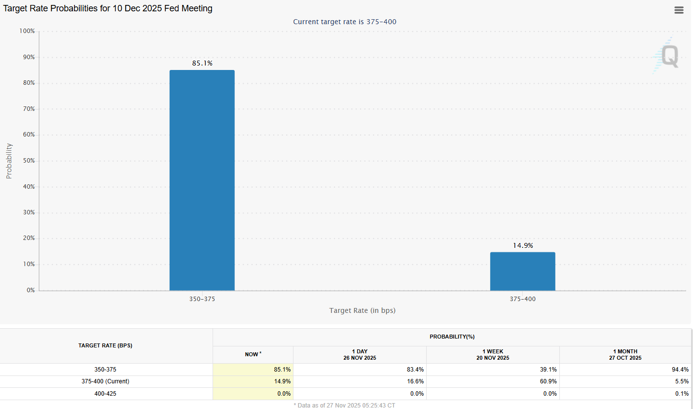 Рынки оценивают вероятность 85% снижения ставки на 25 базисных пунктов, что больше 39% неделю назад, по данным инструмента FedWatch от CME Group.