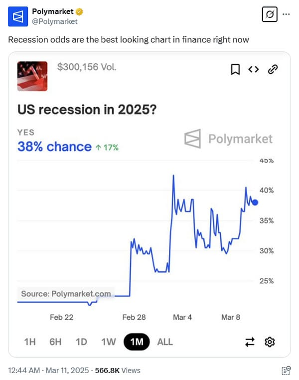 Платформа для ставок на блокчейн Polymarket пошутила, что шансы на рецессию — это «лучший график в финансах прямо сейчас».