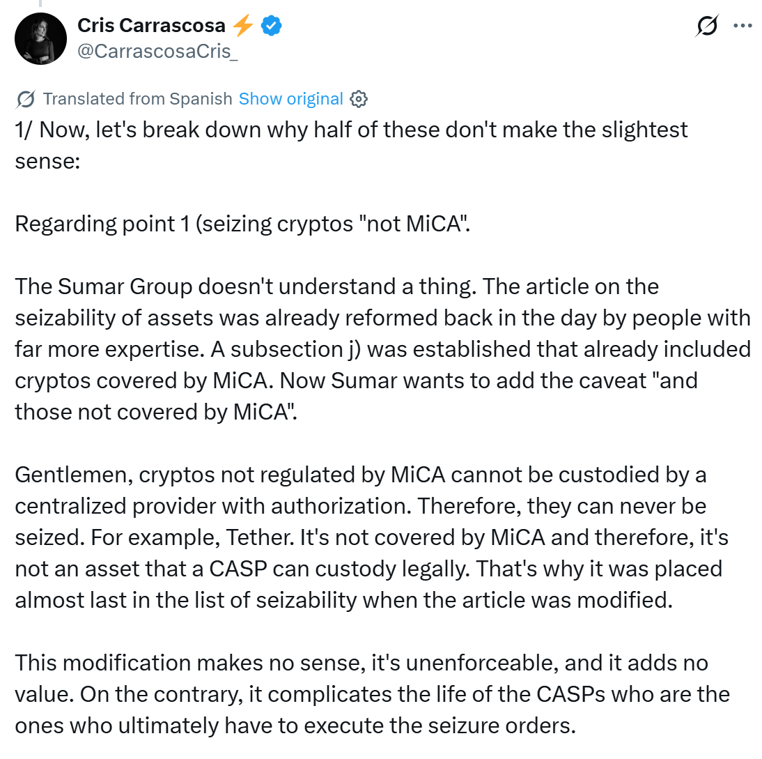 Еще одним спорным элементом стало предложение классифицировать все криптовалюты как арестовываемые активы, подлежащие изъятию. Адвокат Крис Карраскоса заявила на X, что это невыполнимо, особенно для токенов, таких как Tether’s USDT, которые не могут удерживаться регулируемыми кастодианами в соответствии с правилами MiCA.