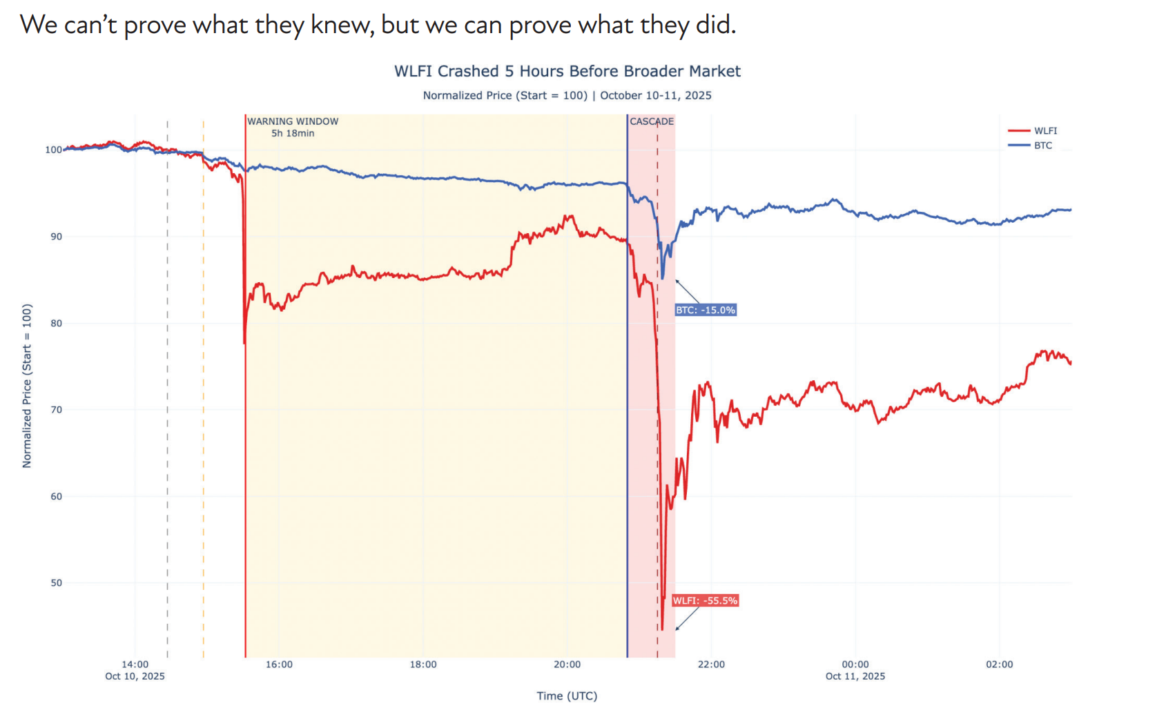 По данным Amberdata, WLFI начал резко падать более чем за пять часов до общего рыночного проседания. В тот момент биткоин торговался около $121 000 и не демонстрировал заметных признаков напряжения.