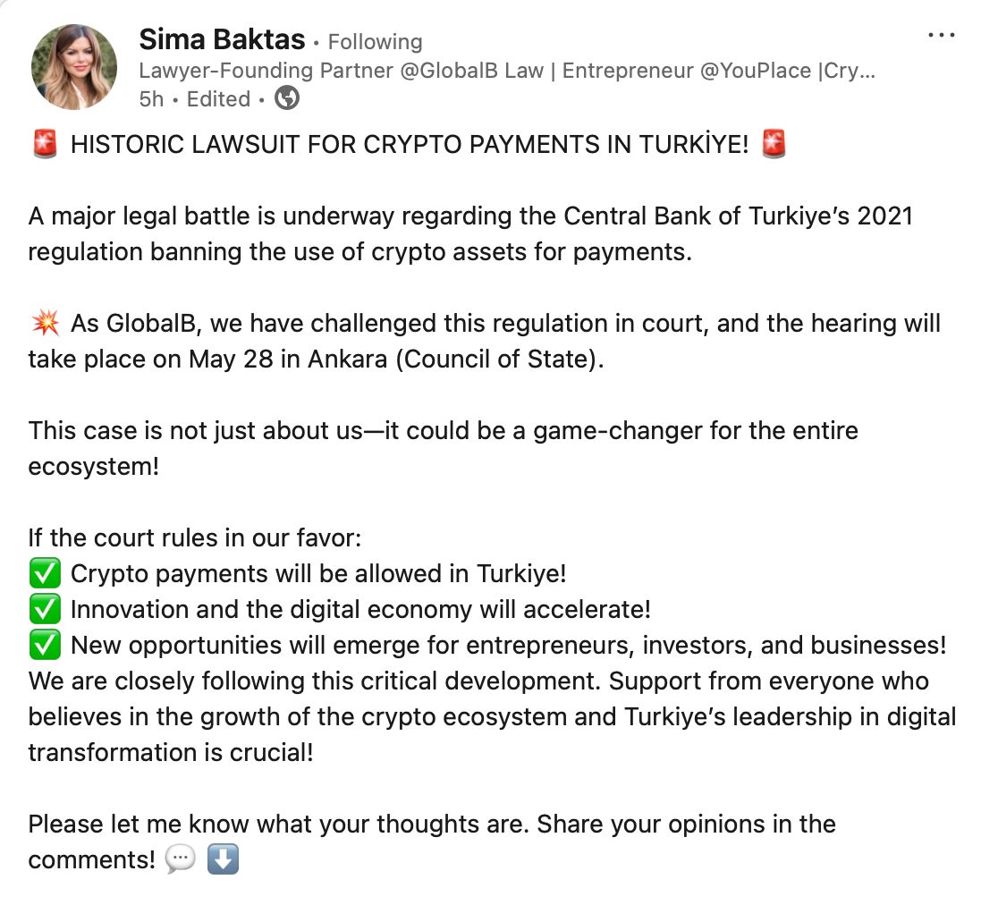 Турецкая юридическая фирма GlobalB обжалует запрет на криптоплатежи в стране, заседание суда назначено на 28 мая, сообщает основатель фирмы Сима Бакташ.