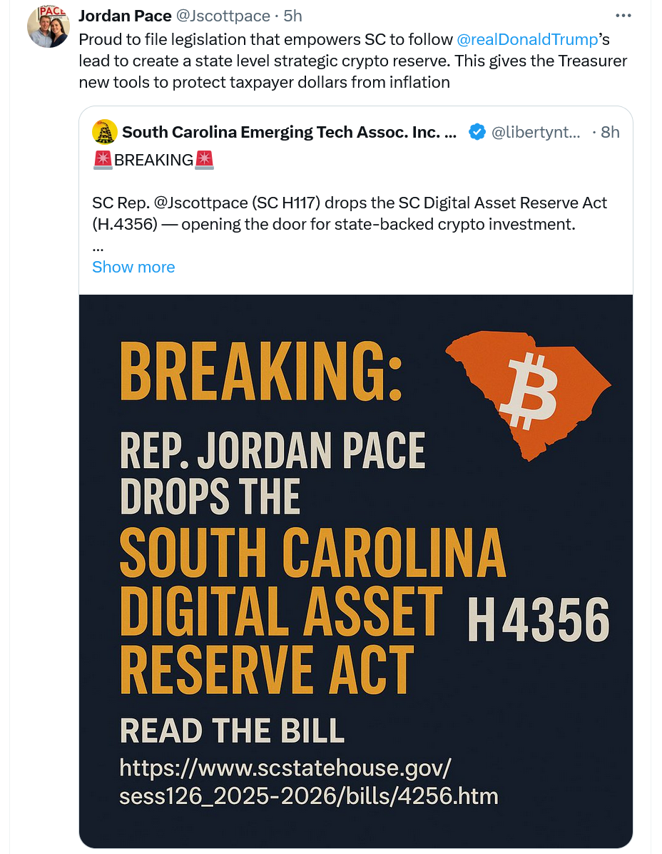 Между тем, 27 марта законодатель штата представил «Закон о стратегическом резерве цифровых активов Южной Каролины», который может позволить казначею штата направить до 10% определённых государственных фондов на криптовалюты, такие как биткойн (BTC).