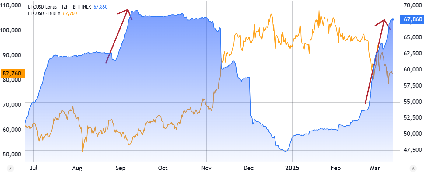 Биткойн/USD (оранжевый, слева) против BTC маржинальных лонгов на Bitfinex (справа). Источник: TradingView