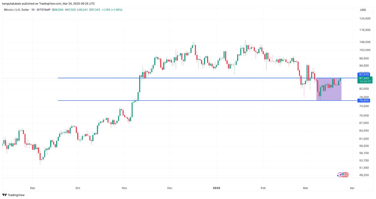 Цена Биткоина (BTC) консолидируется в широком диапазоне от $76,600 до $87,500 с 11 марта.