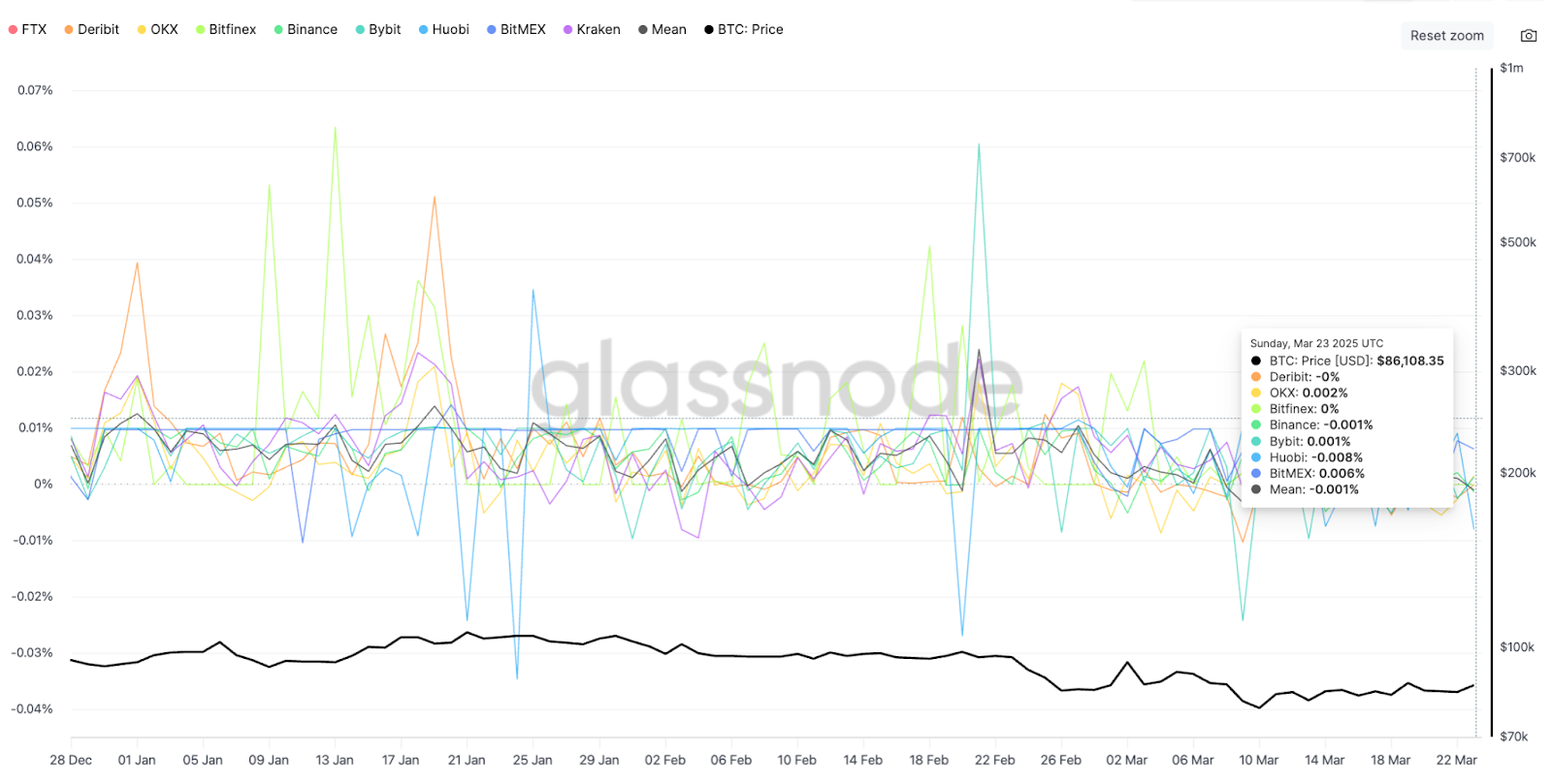 Финансовые ставки бессрочных фьючерсов BTC на всех биржах. Источник: Glassnode