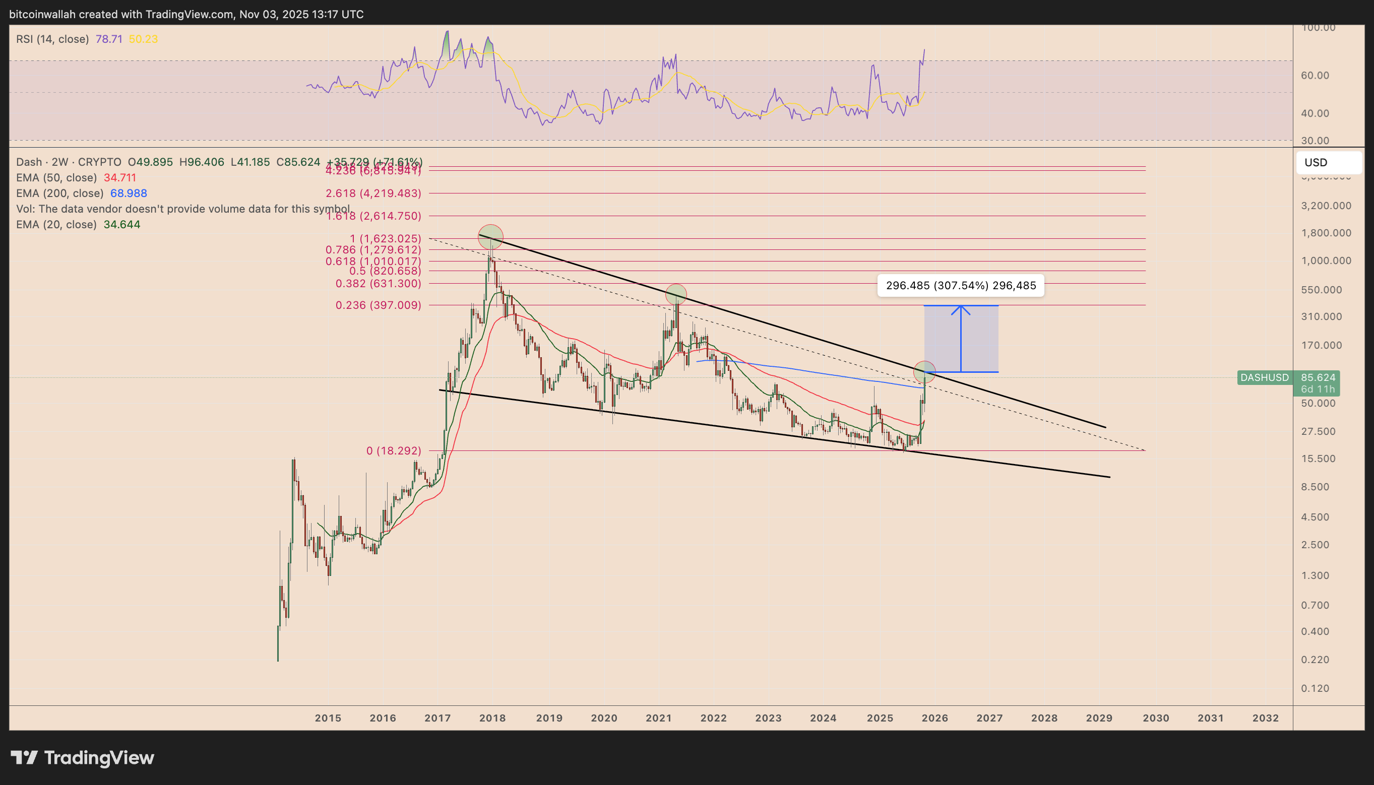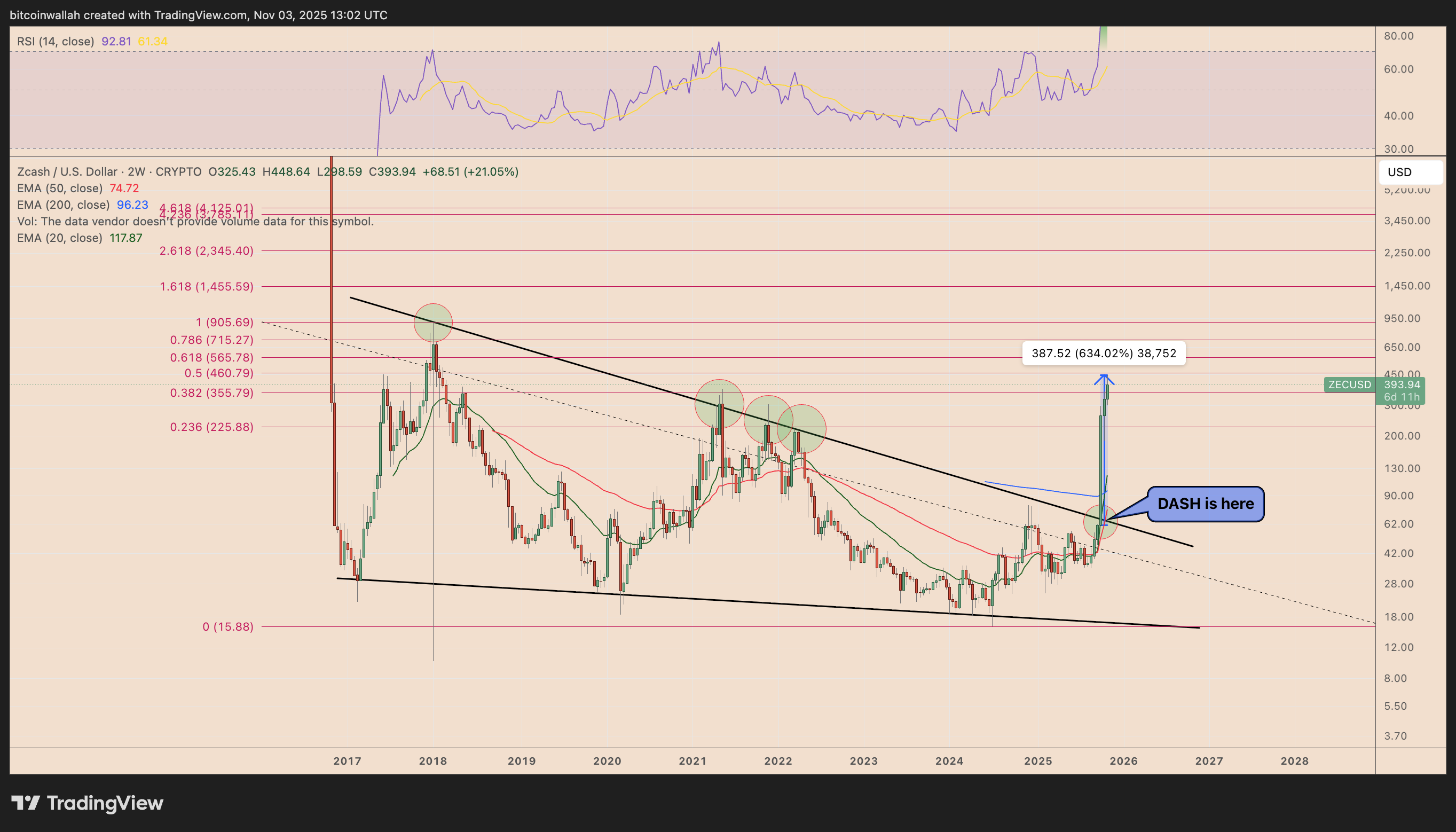 Как ZEC, так и DASH имеют практически идентичные долгосрочные структуры, включающие в себя нисходящие каналы, существующие с 2017 года, и попытки прорыва в конце 2025 года.