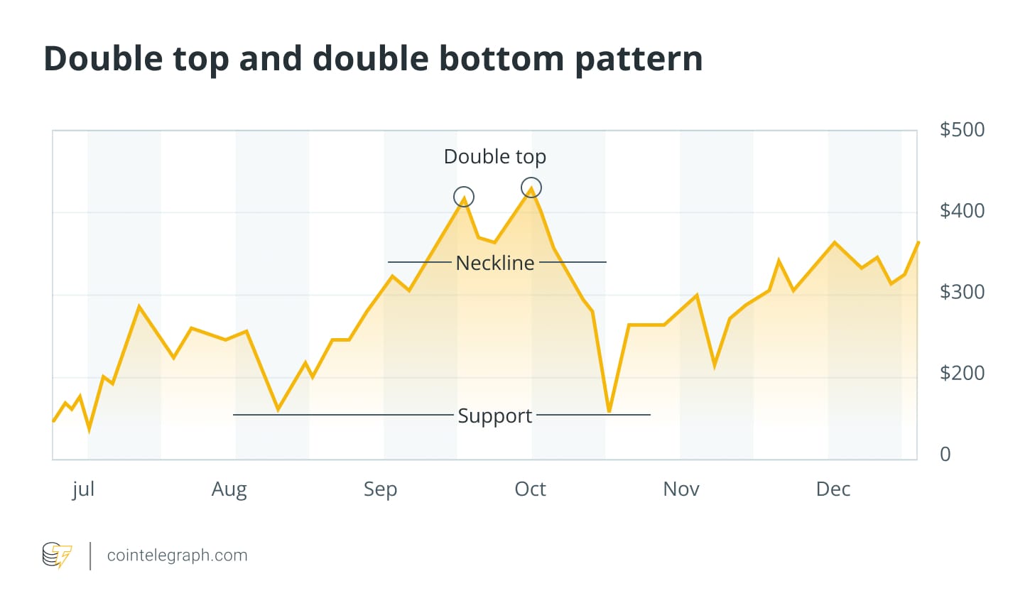 Двойные вершины формируют формации в виде "M" около сопротивления, указывающие на возможный медвежий разворот. Двойные основания формируют формации в виде "W" около поддержки, обозначая возможный бычий разворот.